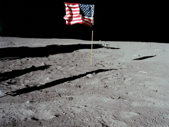 20. Juli 1969: Die amerikanische Fahne. Die Astronauten hatten große Schwierigkeiten, die Flagge in den Mondboden zu rammen. Leider gelang es ihnen nicht besonders gut. Beim Start stürzte die Fahne um. Wenn "Tranquillity Base" dereinst zur historischen Stätte erklärt werden wird, und Touristen diesen Ort besuchen, werden sie die amerikanische Fahne im Staub neben der Landestufe des "Eagle" liegen sehen.