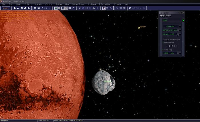 Esta captura de pantalla muestra algunas características de Redshift. Usted puede ver que la luna Fobos es de hecho un modelo 3D que refleja todos los datos disponibles sobre su forma y superficie. Marte es un gran ejemplo de lo que Redshift le entrega usted: Astronomía como una experiencia. Es muy fácil girar alrededor de Marte, aterrizar en el planeta y ver una puesta de sol como un verdadero marciano.