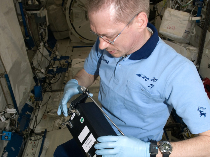 ISS021-E-028096 (17 de noviembre 2009) - Frank De Winne (Agencia Espacial Europea) , comandante de la Expedición 21, trabaja con el experimento RadSilk en el laboratorio Kibo de la Estación Espacial Internacional. RadSilk examina los efectos de la exposición a la radiación en condiciones de microgravedad en los gusanos de seda.
