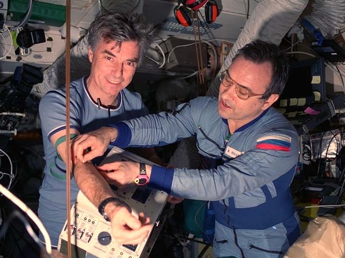 Tomando una muestra de sangre a Ulf Merbold en la misión EuroMir-94