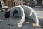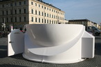 München, Odeonsplatz, 8:30 Uhr. Wie jeden Morgen eilen Berufstätige zur Arbeit oder fahren auf ihren Fahrrädern zur Uni. Doch Ungewöhnliches tut sich heute auf einem der zentralen Plätze Münchens: Mehrere weiße Halbkugeln türmen sich auf dem Pflaster des Platzes und fünf emsige Arbeiter der Firma Baader-Planetarium sind dabei, hier eine echte Sternwartenkuppel aufzubauen. Zusammen mit dem Exzellenz-Cluster Universe und dem Internetportal www.redshift-live.com entsteht hier ein astronomischer Beobachtungspunkt für die Münchner Bürger. Bis Sonntag Abend besteht die Möglichkeit, auf dem Odeonsplatz mit Teleskopen in den Himmel zu schauen und Sonne, Mond und Planeten zu beobachten.