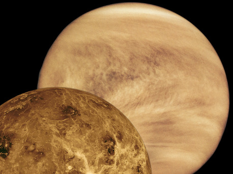 Die Venus, im Sonnensystem der innere Nachbar der Erde, in zwei unterschiedlichen Darstellungen: Rechts oben der Planet, wie er für das menschliche Auge in den Wellen- Längen des sichtbaren Lichts zu sehen ist und so 1978 aus der Perspektive der amerikanischen Raumsonde Pioneer Venus aufgenommen wurde – eingehüllt von seiner dichten Kohlendioxidatmosphäre. Links unten eine Darstellung der unter der Atmosphäre verborgenen Oberfläche der Venus. Dieses Bild entstand 1996 auf der Grundlage von Radar- Daten des amerikanischen Venusorbiters Magellan.
