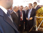 Auf dem Internationalen Luft- und Raumfahrtsalon MAKS in Moskau am 18. August 2009, von links nach rechts: Der russische Ministerpräsident Wladimir Putin, Prof. Dr.-Ing. Johann-Dietrich Wörner (Vorstandsvorsitzender des DLR) und Prof. Gregor Morfill (Max-Planck-Institut für extraterrestrische Physik) vor einem Modell des Röntgenteleskops eROSITA.