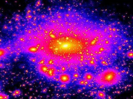 Dieses Bild von einer Supercomputer-Simulation zeigt die Dichte der dunklen Materie in unserer Milchstraße. Die Farbskala von blau über violett zu rot und gelb korrespondiert in dieser Falschfarbenaufnahme mit einer Zunahme von Dunkler Materie. Die helle Zentralregion repräsentiert das leuchtkräftige Zentrum unserer Galaxis aus Gas und Sternen. Die klumpige Struktur in deren Außenbereichen zeigt Ansammlungen von Dunkler Materie, die wiederum Sternmaterie und Gas gravitativ an sich bindet.