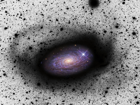 Sternströme um die Spiralgalaxie M 63: Überreste einer kleineren Satellitengalaxie, die sich M 63 einverleibt hat. In der Bildmitte ein herkömmliches positives Bild; die äußeren Regionen sind als Bildnegativ gezeigt, damit die schwach leuchtenden Strukturen, nach denen in dieser Durchmusterung gesucht wurde, klarer hervortreten. M 63 ist rund 30 Millionen Lichtjahre von der Erde entfernt. Mit dieser Durchmusterung ist es erstmals gelungen, Spiralgalaxien, die sich kleinere Satellitengalaxien einverleiben, jenseits unserer »lokalen Gruppe« von Galaxien nachzuweisen.