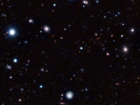 Das internationale Astronomenteam nutzte die leistungsfähigen Instrumente VIMOS und FORS2 am Very Large Telescope (VLT) der ESO, um die Entfernung zu Mitgliedern einer Ansammlung von lichtschwachen, roten Objekten zu bestimmen, die das Weltraumteleskop Spitzer zuvor entdeckt hatte. Diese Ansammlung von Galaxien mit der Bezeichnung CL J1449+0856 [1] wies alle Anzeichen eines sehr weit entfernten Galaxienhaufens auf [2]. Tatsächlich ergab die Auswertung der Beobachtungen, dass es sich um einen Galaxienhaufen handelt, den wir in jenem Zustand sehen, den er hatte als das Universum nur etwa 3 Milliarden Jahre alt war – weniger als ein Viertel seines heutigen Alters [3].