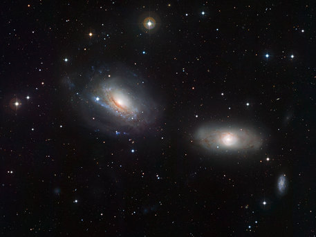 Dieses kosmische Galaxienpärchen wurde vom Wide Field Imager am MPG/ESO 2,2-Meter-Teleskop am La Silla Observatorium in Chile im Bild eingefangen. Auffällige Strukturen der Galaxien zeigen, dass jede den Schwerkrafteinfluss des jeweils anderen Sternsystems zu spüren bekommt. Dieser Einfluss hat die Spiralstruktur der ersten Galaxie namens NGC 3169 verdrillt und die Staubbänder in ihrem Begleiter NGC 3166 an mehreren Stellen durchtrennt. Eine dritte, kleinere Galaxie mit der Bezeichnung NGC 3165 schaut dem gegenseitigen Ziehen und Verwirbeln durch die Schwerkraft, mit dem ihre beiden größeren Nachbarn beschäftigt sind, aus der ersten Reihe zu.