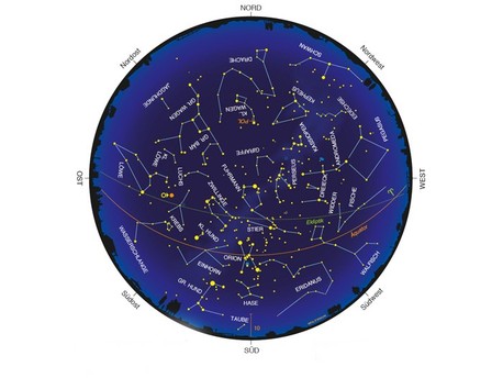 Im Süden haben sich jetzt alle Wintersternbilder versammelt. Kapella im Fuhrmann steht fast im Zenit, Sirius im Großen Hund horizontnah. Von allen Wintersternbildern ist der Orion das prominenteste. Der Mythologie nach ist Orion ein Jäger und Krieger. Seine einprägsame Sternenfigur steht im Januar zur Standardbeobachtungszeit halbhoch im Süden.