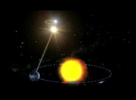 Durch die jährliche Bewegung der Erde (blauer Kreis) um die Sonne (großer gelber Kreis) scheint sich die Position eines nahen Sterns (kleiner gelber Kreis) vor dem entfernten Hintergrund zu verschieben. Der Stern beschreibt im Laufe eines Jahres eine winzig kleine Ellipse beziehungsweise einen Kreis am Himmel. (Die Darstellung übertreibt diese scheinbare Verschiebung stark.)