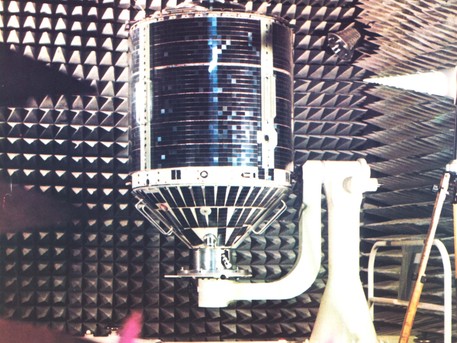 Das Foto zeigt AZUR, noch auf der Erde, in einem schalltoten Raum. Dort wurden die Kenndaten der Bord- Antennen sowie das Reflexionsverhalten des gesamten Satelliten ermittelt.