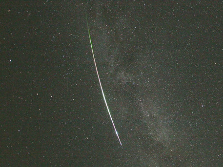 Ein heller Meteor, der am 13. August 2007 um 22.39 Uhr von der Station Wettzell beobachtet wurde: Zusätzlich fotografieren im Rahmen des europäischen Feuerkugel-Netzwerks - an dem auch das DLR teilnimmt - jede Nacht 25 automatisch arbeitende Kamerastationen den Himmel über Mitteleuropa und registrieren bei klarer Sicht alle Meteore.