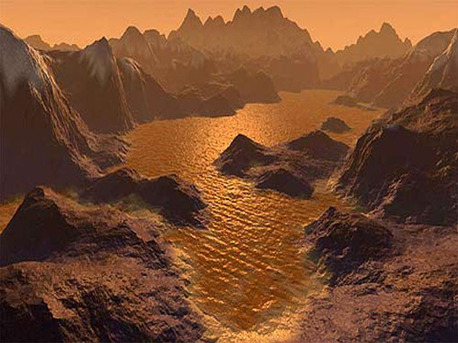 Künstlerische Darstellung der vermuteten Kohlenwasserstoff-Seen auf Titan. Potenzielle Lebensräume für Mikroorganismen?