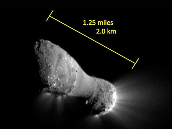 The image, one of the closest taken of comet Hartley 2 by NASA's EPOXI mission, shows many features across the comet's surface. The length of the comet is equal to the distance between the Capitol building and the Washington Monument in Washington. There are two obvious regions of jet activity associated with rough terrain. The smooth surface in the middle is lower than the rest of the comet and may accumulate fine-grain dust.