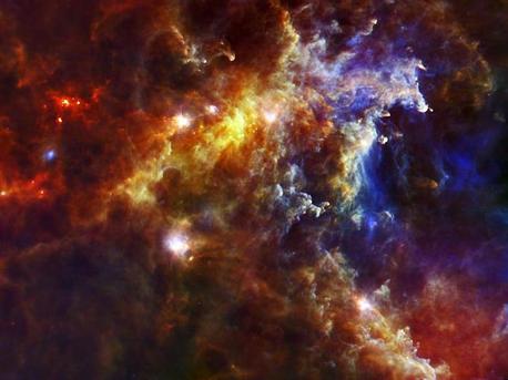 This image from the Herschel Space Observatory shows most the cloud associated with the Rosette nebula, a stellar nursery about 5,000 light-years from Earth in the Monoceros, or Unicorn, constellation. Herschel collects the infrared light given out by dust. The bright smudges are dusty cocoons containing massive embryonic stars, which will grow up to 10 times the mass of our sun. The small spots near the center of the image are lower mass stellar embryos. The Rosette nebula itself, and its massive cluster of stars, is located to the right of the picture.