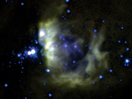 Mid-infrared image of BYF 73 from NASA's Spitzer Space Telescope. The yellowish wisps to the right are remnants of gas that have been heated and are being driven off by the massive young stars within them (seen in blue). The large-scale collapse of colder gas to form a massive cluster is centred around the bright stars just to the left of the heated wisps.