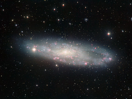 This image of NGC 247, taken by the Wide Field Imager on the MPG/ESO 2.2-metre telescope at ESO’s La Silla Observatory in Chile, reveals the fine details of this highly inclined spiral galaxy and its rich backdrop. Astronomers say this highly tilted orientation, when viewed from Earth, explains why the distance to this prominent galaxy was previously overestimated.