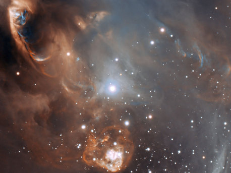 This enhanced-colour picture [3] was created from images taken using the FORS1 instrument on ESO’s Very Large Telescope. Images were taken through two different filters that isolate the light coming from glowing hydrogen (shown as orange) and glowing ionised sulphur (shown as blue). The different colours in different parts of this violent star formation region reflect different conditions — for example where ionised sulphur is glowing brightly (blue features) the velocities of the colliding material are relatively low — and help astronomers to unravel what is going on in this dramatic scene.