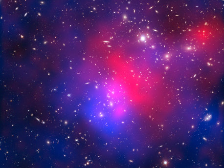 The galaxies in the cluster are clearly visible in the VLT and Hubble images. Although the galaxies are bright they make up less than 5% of the mass there. The rest is gas (around 20%), which is so hot that it shines only in X-rays, and dark matter (around 75%), which is completely invisible. To understand what was going on in the collision the team needed to map the positions of all three types of matter in Abell 2744.