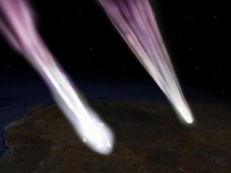 This artist's concept depicts the Hayabusa spacecraft (left) and sample return capsule (right) entering the atmosphere over South Australia.