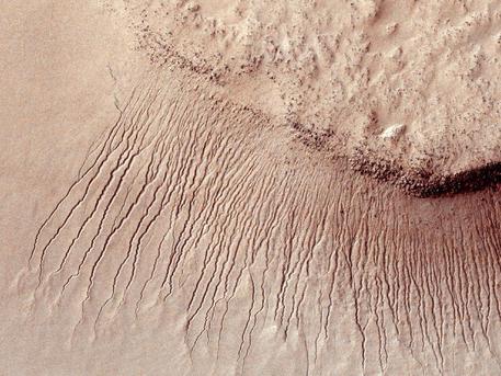 Images like this from the High Resolution Imaging Science Experiment (HiRISE) camera on NASA's Mars Reconnaissance Orbiter show portions of the Martian surface in unprecedented detail. This one shows many channels from 1 meter to 10 meters (approximately 3 feet to 33 feet) wide on a scarp in the Hellas impact basin. On Earth we would call these gullies. Some larger channels on Mars that are sometimes called gullies are big enough to be called ravines on Earth. This view is an excerpt from a HiRISE observation taken on Jan. 14, 2011, nearly five years after the March 10, 2006, arrival of the Mars Reconnaissance Orbiter at Mars. North is up. The image was taken at 3:44 p.m. local Mars time. Additional image products from this observation are available at http://hirise.lpl.arizona.edu/ESP_020940_1315 . The observation is centered at 48.4 degrees south latitude, 73.5 degree east longitude.