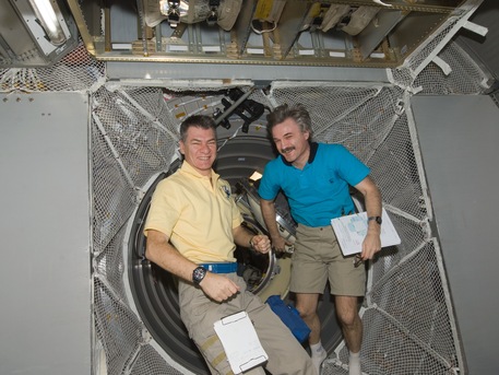 ESA astronaut Paolo Nespoli (top) and Russian cosmonaut Alexander Kaleri, both Expedition 26 flight engineers, work in the newly-attached ESA's ATV Johannes Kepler of the International Space Station. NASA photo iss026e029705.