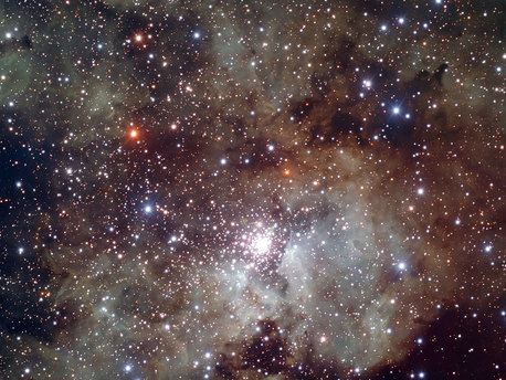 La nueva imagen, obtenida con el instrumento FORS del VLT en el Cerro Paranal, Chile, grafica un amplio campo alrededor del cúmulo estelar y revela la rica textura de las nubes de gas y polvo circundantes.