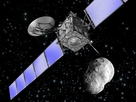 Vista artística de la sonda Rosetta de la ESA. La nave está cubierta con aislamiento térmico oscuro para mantener su calor, mientras que se aventura en la frialdad del Sistema Solar exterior, más allá de la órbita de Marte. La sonda Rosetta fue lanzada por un Ariane 5 el 2 de marzo de 2004, en un viaje de 11 años hacia el cometa 67P / Churyumov-Gerasimenko.